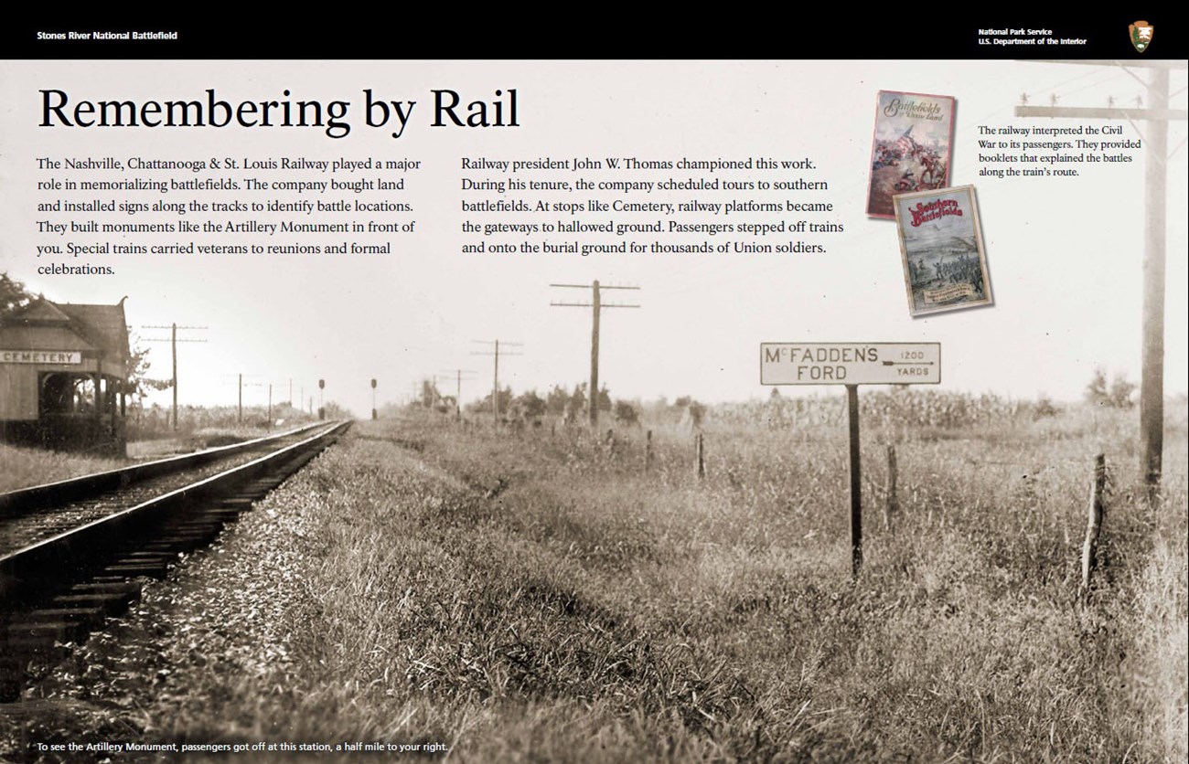 Wayside Exhibit - Remembering By RailExhibit Text: The Nashville, Chattanooga & St. Louis Railway played a major role in memorializing battlefields. The company bought land and installed signs along the tracks to identify battle locations. They built monuments like the Artillery Monument in front of you. Special trains carried veterans to reunions and formal celebrations. Railway president John W. Thomas championed this work. During his tenure, the company scheduled tours to southern battlefields. At stops like Cemetery, railway platforms became the gateways to hallowed ground. Passengers stepped off trains and onto the burial ground for thousands of Union soldiers. |
