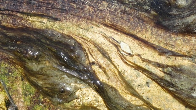 - Yellow deposits here typically contain sulfur. Some thermophiles live in these areas because they use chemicals like sulfur for energy, sometimes creating hydrogen sulfide gas (the rotten egg odor). They form communities of mats and streamers that look like waving clumps of hair, in the hottest acidic runoff, which measure between 140°F/ 60ºC and 181°F / 83ºC.