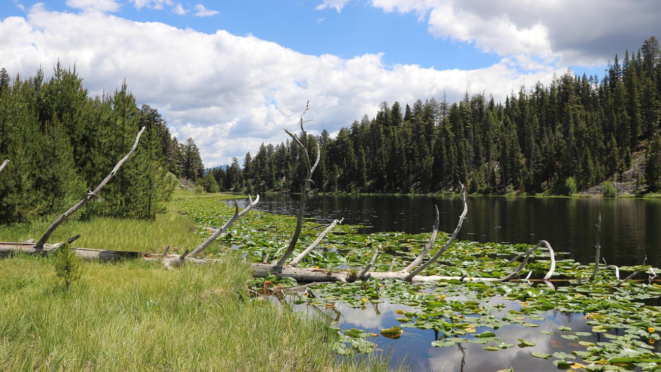 This trail begins behind Roosevelt Lodge and climbs 300 feet (91 m) onto the bench. Here it joins the Roosevelt horse trail and continues west to Lost Lake. From Lost Lake the trail follows the contour around the hillside to the Petrified Tree parking area, crosses the parking lot and continues up the hill. It loops behind Tower Ranger Station, crosses the creek and returns to the lodge.
