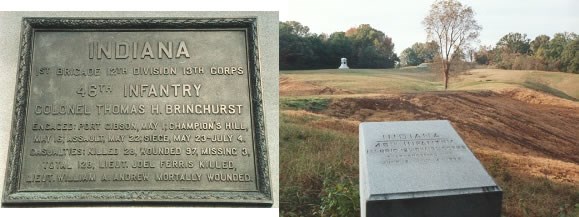 Monument is located on Union Avenue 100 yards south of Fort Garrott. Also a marker designating a sharpshooter's line located between Union Avenue and Confederate Avenue southwest of Park Tour Stop #15 and a marker designating the camp site located on Union Avenue at the sweeping turn between Park Tour Stops #14 & #15. This unit was attached to Brig. Gen. George F. McGinnis' 1st Brigade of Brig. Gen. Alvin P. Hovey's 12th Division, Maj. Gen'ls John A. McClernand (relieved of command 19 June 1863) & Edward O.C. Ord's XIII Army Corps and was commanded by Col. Thomas H. Bringhurst.