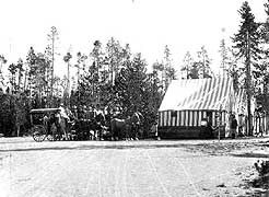 NPS/YELL 90058-1 This mountain stage used by the Shaw and Powell Camping Company was manufactured circa 1898. Also known as a mountain spring wagon, it has a raised driver's seat and luggage boot, and 3 passenger seats, and could carry up to eleven passengers (one or two sitting beside the driver). The body is painted gray/green (now faded), with an under-layer of dark green paint, while the undercarriage is painted yellow with black pin striping. Extensive graffiti ranging from 1910 through 1944 is also visible on the stage.