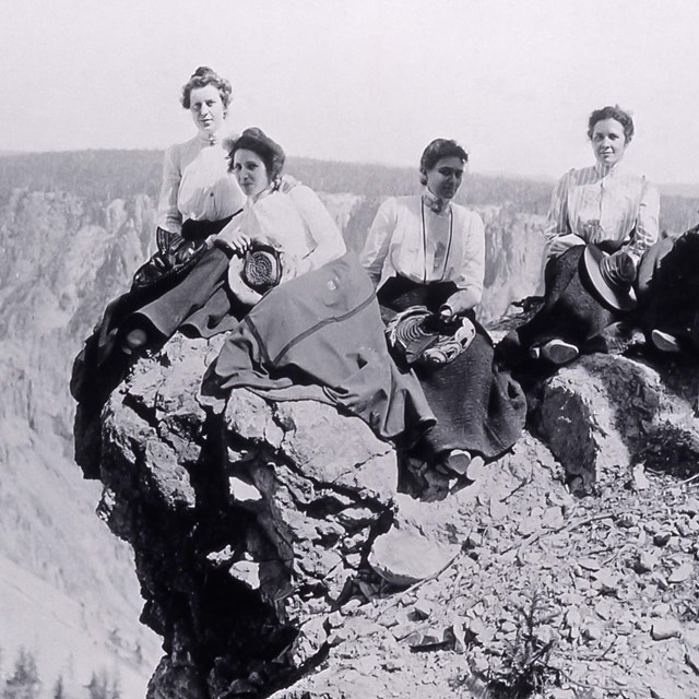 • Historic photograph of employees sitting on the rim of a canyon