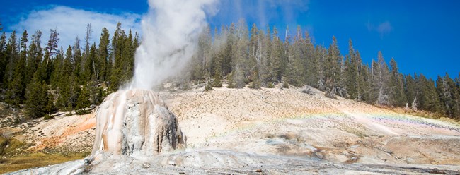 NPS/Neal Herbert Investigate Old Faithful's Geologic StoryTour exhibits about the geologic forces behind Old Faithful and Yellowstone at the Old Faithful Visitor Center. Kids of all ages can get Junior Ranger and Young Scientist booklets from rangers. Evidence of the geological forces that have shaped Yellowstone are found in abundance in this district. The hills surrounding Old Faithful and the Upper Geyser Basin are reminders of Quaternary rhyolitic lava flows. These flows, occurring long after the catastrophic eruption of 600,000 years ago, flowed across the landscape like stiff mounds of bread dough due to their high silica content. Evidence of glacial activity is common, and it is one of the keys that allows geysers to exist. Glacier till deposits underlie the geyser basins providing storage areas for the water used in eruptions. Many landforms, such as Porcupine Hills north of Fountain Flats, are comprised of glacial gravel and are reminders that as recently as 13,000 years ago, this area was buried under ice. Signs of the forces of erosion can be seen everywhere, from runoff channels carved across the sinter in the geyser basins to the drainage created by the Firehole River. Mountain building is evident as you drive south of Old Faithful, toward Craig Pass. Here the Rocky Mountains reach a height of 8,262 feet (2518 m), dividing the country into two distinct watersheds.