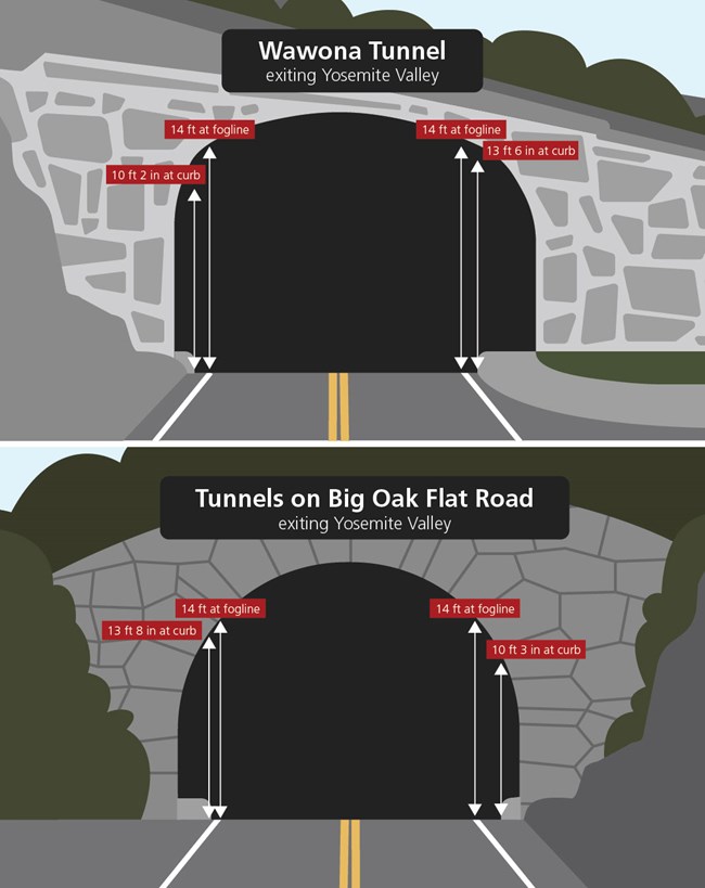 Commercial trucking through Yosemite is prohibited. Wawona RoadContinuation of Highway 41 inside the park Maximum vehicle length: 45 feet (for single vehicles). Big Oak Flat RoadContinuation of Highway 120 from the west into the park Maximum vehicle length: 45 feet for single vehicle. El Portal RoadContinuation of Highway 140 inside the park Maximum vehicle length: 45 feet for single vehicle, 60 feet for combination vehicle, 35 feet for towed vehicle from hitch to rear bumper Note: Highway 140 outside the park (between El Portal and Mariposa) can accommodate vehicles up to 45 feet long (this applies to single vehicles and total length of combinations). Tioga RoadContinuation of Highway 120 through the park Read below for tips on pulling a trailer over Tioga Pass. Glacier Point RoadMaximum vehicle length: Beyond Sentinel Dome/Taft Point trailhead, 30 feet for single vehicle, no trailers. Buses longer than 30 feet or with capacity of 26 passengers or more are not permitted beyond the Badger Pass Ski Area. Seasons: Closed from approximately November through May (Badger Pass portion of the road is open from approximately mid December through March). Overnight parking on the Glacier Point Road between Badger Pass and Glacier Point is not permitted between October 15 and the opening of the road in spring. Mariposa Grove RoadMaximum vehicle length: 25 feet; no trailers permitted. Hetch Hetchy RoadMaximum vehicle length: 25 feet Tips for Pulling a Trailer over Tioga PassHighway 120 between Tioga Pass and its junction with US 395 is a steep, winding mountain road. The steepest portion of the road is an eight-mile section that ascends about 2,500 feet (from Lee Vining toward Tioga Pass). Portions of the road have a grade as steep as eight percent. Other considerations: 1. Adhere to the towing capacity of your vehicle (you might be able to tow a trailer that is heavier than what your vehicle is set up to tow on other roads, but it might not work if you're going up or down this grade); adjust your braking system if you can. 2. Know your driving skills and what you are capable of doing. 3. Many vehicles towing trailers make it up to Tioga Pass (slowly and patiently). However, you may not be able to keep up with other traffic--if you try to, your vehicle may overheat. So, don't try to drive the same speed as other cars that aren't towing vehicles; use the pullouts when you can to allow them to pass you. 4. If you do break down (engine overheating, brakes fail, etc.) be aware that you might be waiting several hours for help (especially if you come through later in the day when fewer people can help you). Have a plan if you break down. |