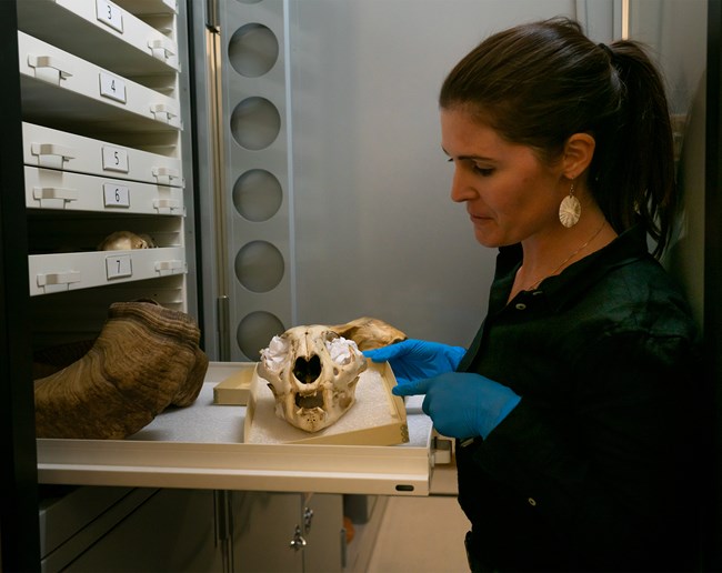 National Park Service curator examines an animal skull in Zion's museum collection.